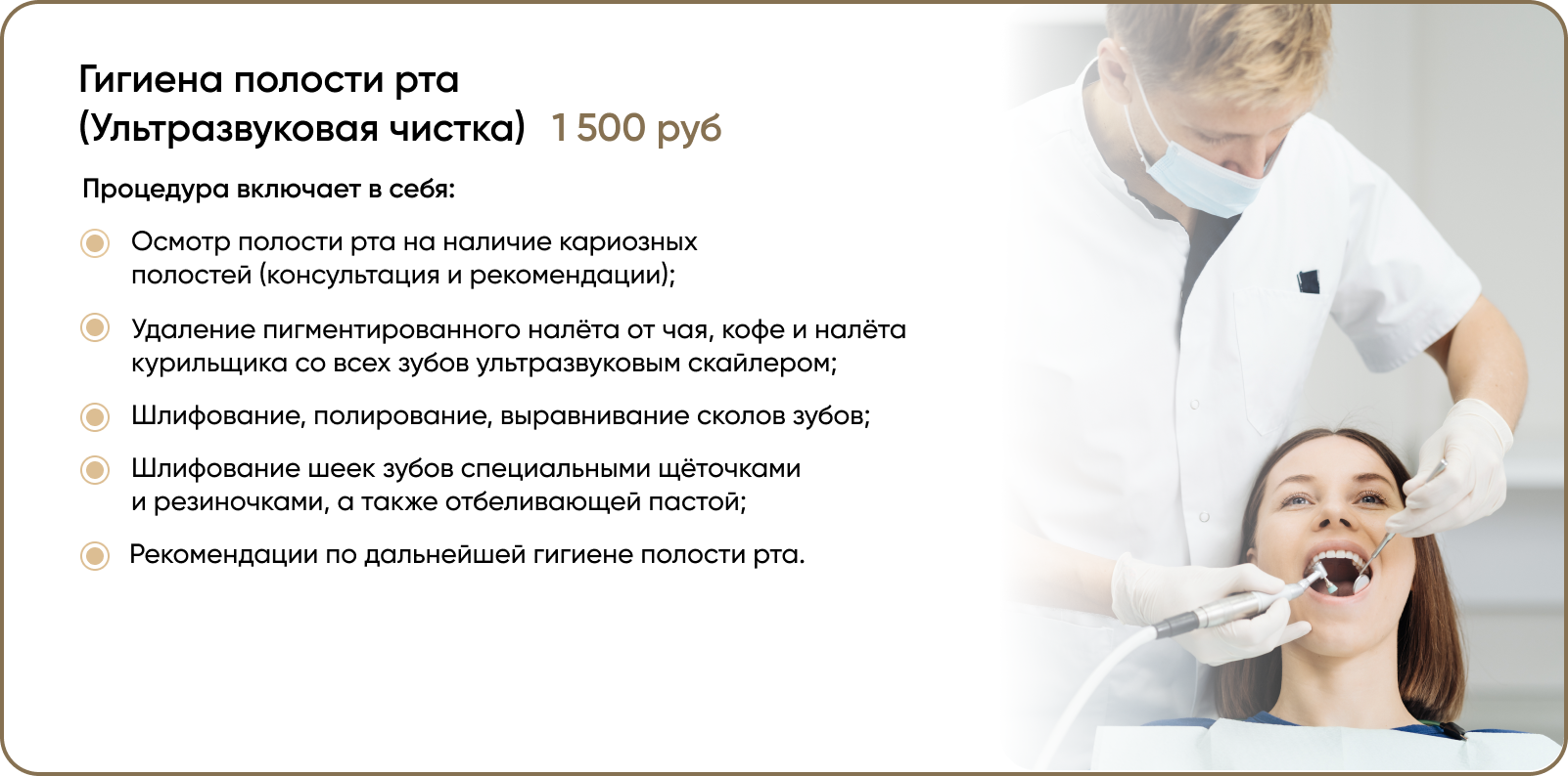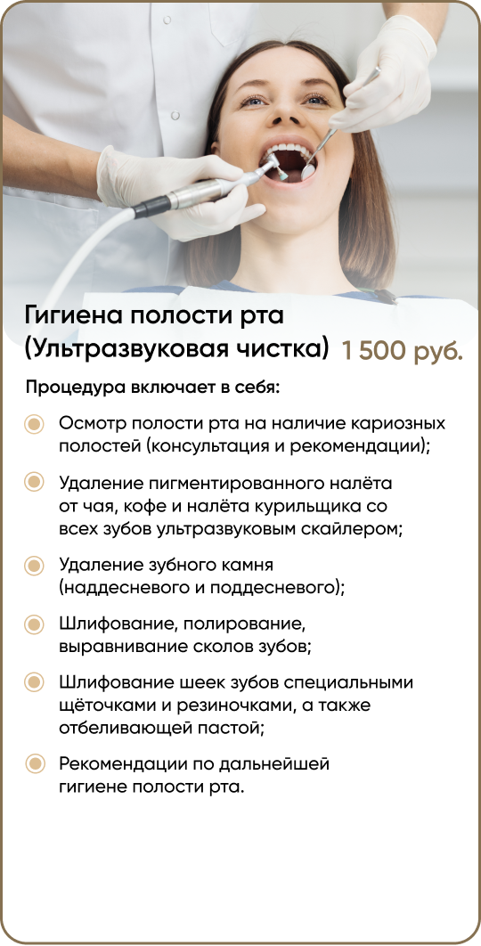 Удаление пигментированного налёта от чая, кофе и налёта курильщика со всех зубов ультразвуковым скайлером;